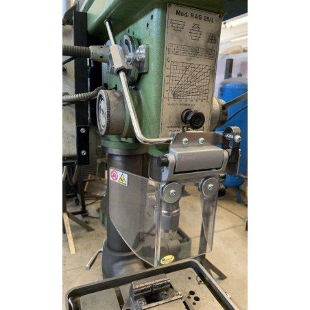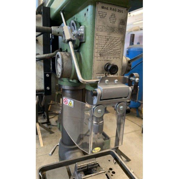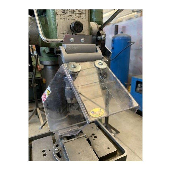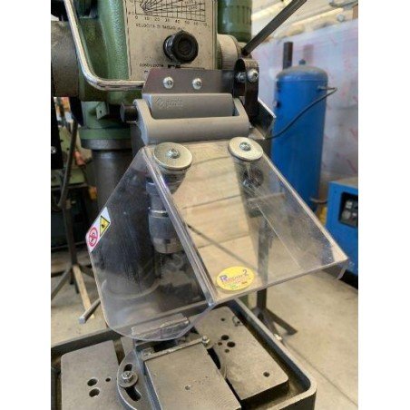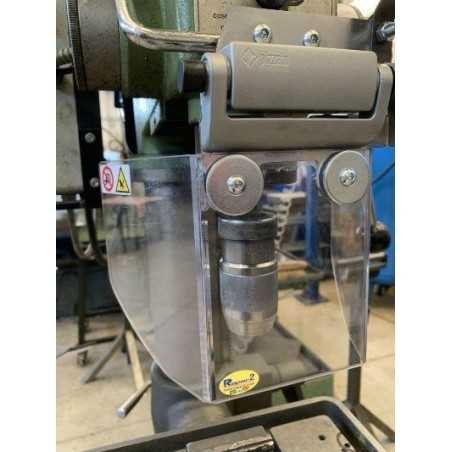 Protective cover for drilling machine consisting of an angular folding screen in impact-resistant and scratch-free polycarbonate mounted on a support provided with a safety switch.