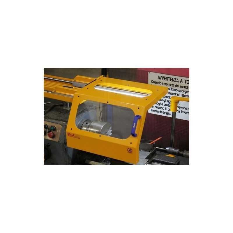 Protective cover for the chuck of a lathe consisting of a shield sliding over ball bearings and equipped with a safety switch.
