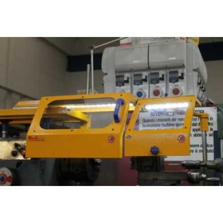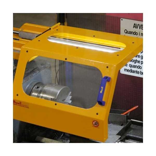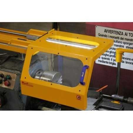 The structure over which the shield glides is adjustable in height and is mounted on the fixed head of the lathe.