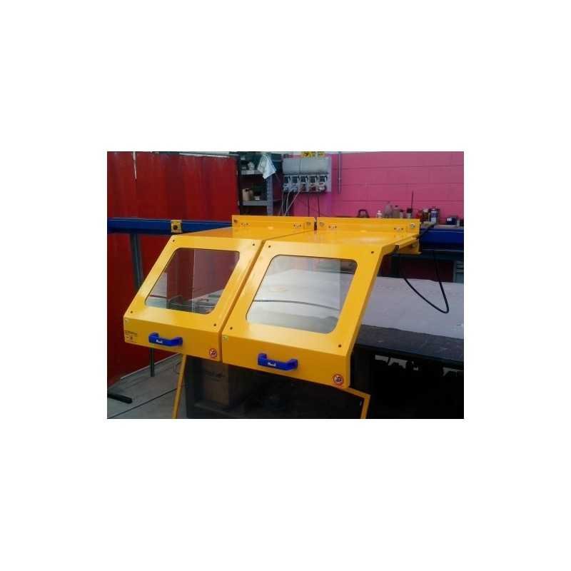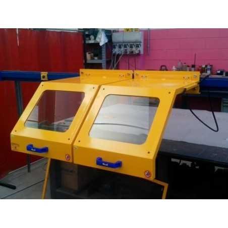 Double protection cover consisting of a steel frame filled with safety glass, sliding over a tubular structure attached to the rear of the machine, equipped with a safety switch. The machine will stop when one or both guards open. This model protects the operator against direct contact with the workpiece, coolant and chips. Benefits: - Easy sliding cover - Large field of vision - Improved protection Specifications: - Rail length: 2500mm - dimensions of the shields: 400x450x500mm - double-layered safety glass 3 + 3mm - LED-lighting - Safety switch - Device supplied with CE conformity certificate and an installation and usage sheet