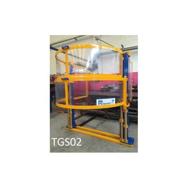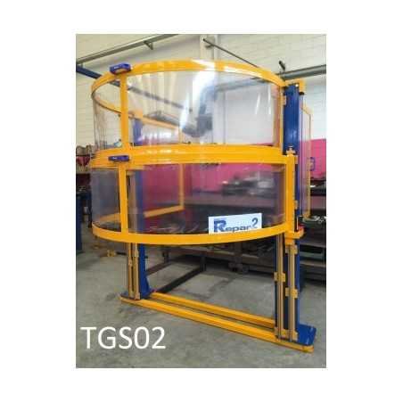 Protective cover for vertical lathe, consisting of a dome-shaped shield with steel frame and filled in with impact-resistant and scratch-free polycarbonate. Simple vertical movement via a counterweight placed in the tubular structure that is attached to the machine. There are 2 models available; those with a single dome (TGS01CM) and those with a double dome (TGS02CM). The screen is equipped with a safety switch.
