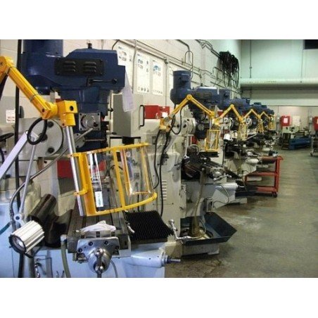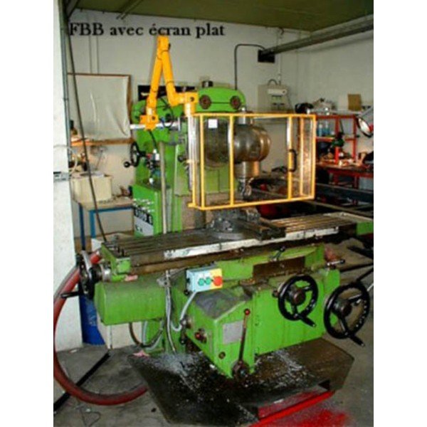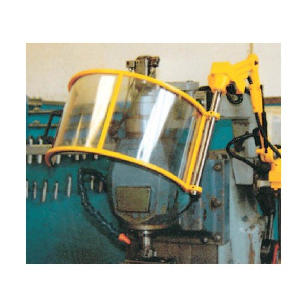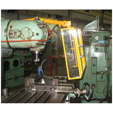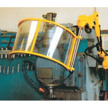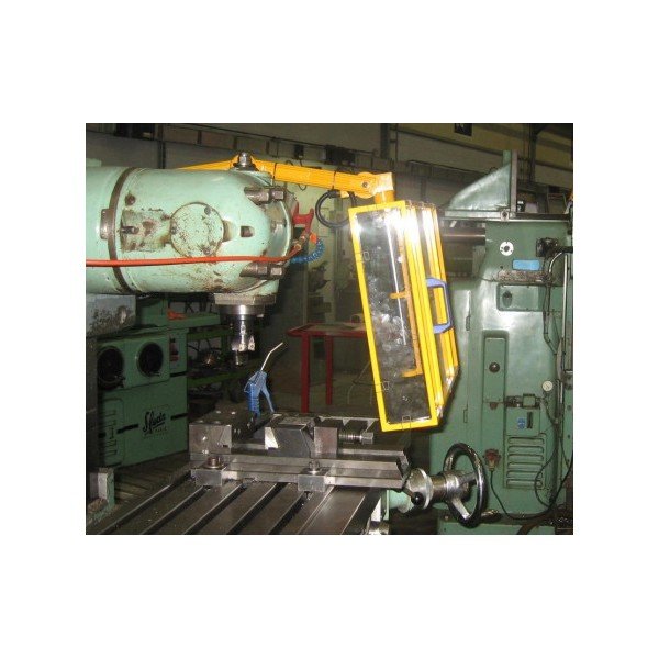 Spindle shield for a milling machine composed of a screen with an angular steel frame, filled in with impact-resistant and scratch-free polycarbonate (P) or safety glass (V), mounted on an articulable arm with 3 safety switches. The articulable arm is also provided with a gas spring that allows vertical movement of the shield.