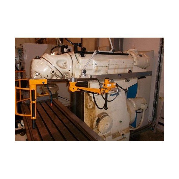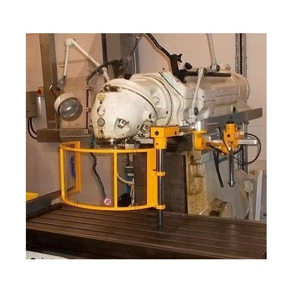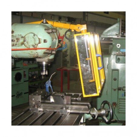 Spindle shield for a milling machine composed of a round screen with steel frame, filled in with impact-resistant and scratch-free polycarbonate, mounted on an articulable arm in tubular structure with three safety switches and halogen lamp (LLS20) on the round screen and LED lamp (LLS7) on the flat screen .