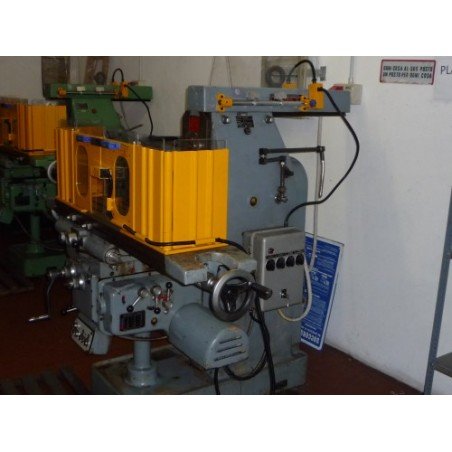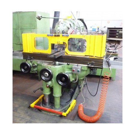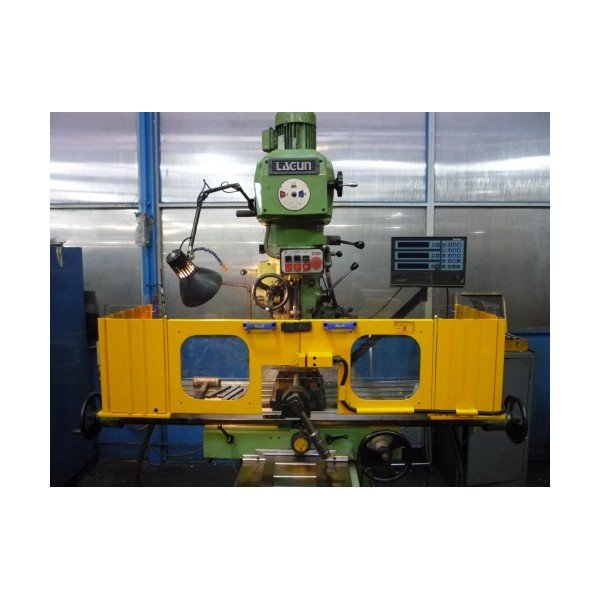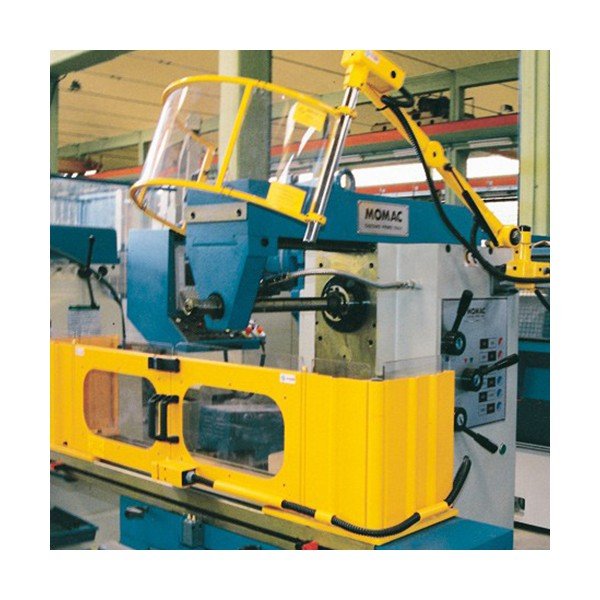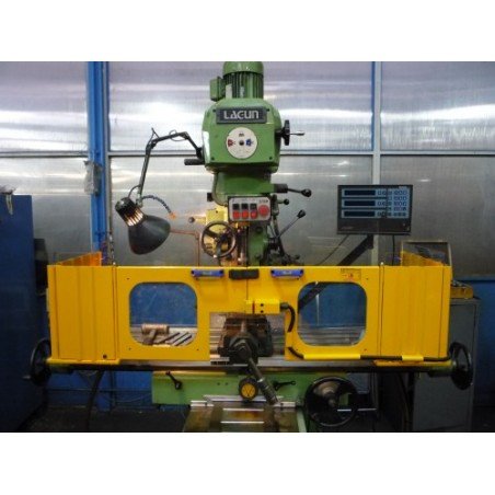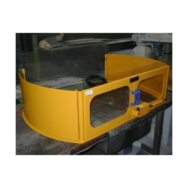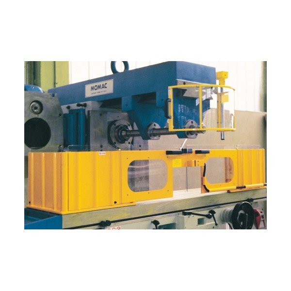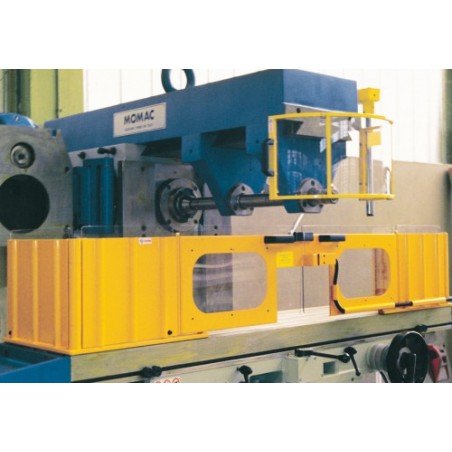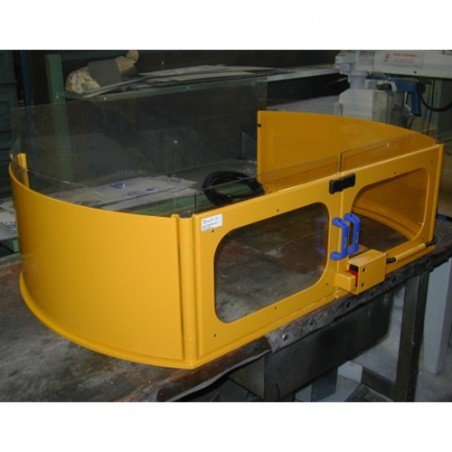 Double shield for milling machine to be mounted on the table. The shield is provided with 2 fixed metal pieces, each equipped with a hinged door filled with height-adjustable impact-resistant and scratch-free polycarbonate. The guards laterally, in metal, are easy to open for machining longer workpieces.