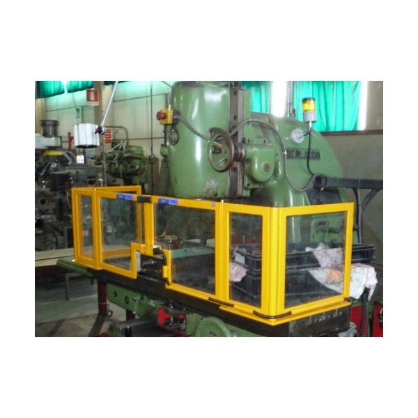 Double shield for milling machine to be mounted on the table. The screen is provided with 2 fixed parts, each equipped with a hinged door and filled with impact-resistant and scratch-free polycarbonate. The lateral guards, in polycarbonate, are easy to open for machining longer workpieces. The door panels that give access to the clamping surface of the table are (TAM) or not (TA) provided with an opening for a vice. The door panels are equipped with a safety switch. There is a choice of 3 standard models, being type 1 with a height of 300 mm, 2 with a height of 400 mm and type 3 with a height of 500 mm. Customization also possible. Benefits : - Improved security - Easy to open lateral panels for machining longer workpieces - Door with or without opening for machine vice - Polycarbonate frontal and lateral Specifications: - Double hinged door with or without opening for machine vice - Width of the panel laterally: 500 mm - Frontal length: 1000mm - Customization possible - Safety switch - Device supplied with CE conformity certificate and an installation and usage sheet