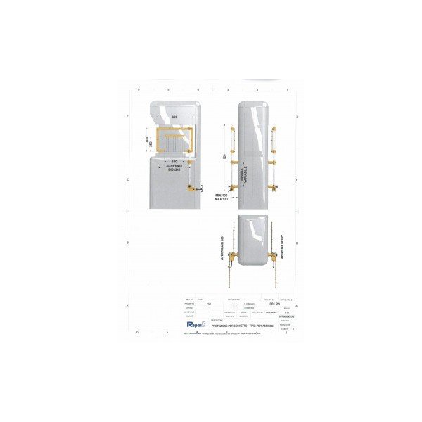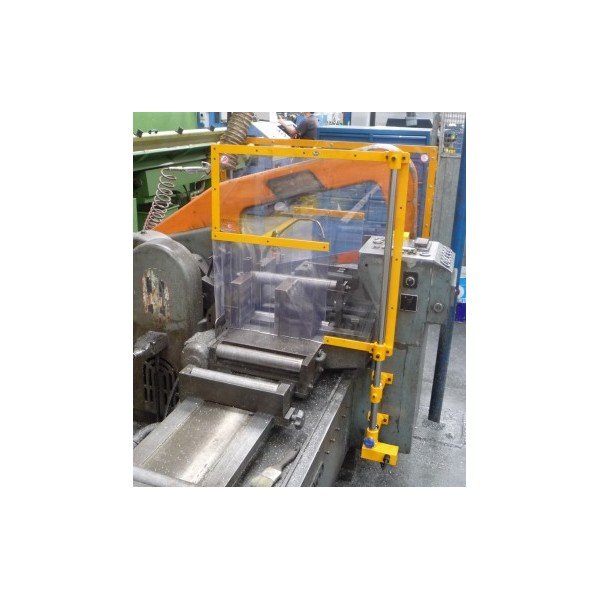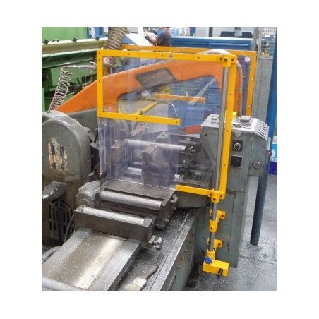 Double shielding for band and hacksaw machines consisting of a set of scratch-free and impact-resistant polycarbonate panels attached to a double bracket with safety switch. The opening through which the material is fed is provided with weather strips. The panels can be turned to adjust or clean the machine. The machine cannot work when the panels are open. Benefits: - Large swing-open panels - Easy height adjustment - Easy to install Specifications: - 2 panels in polycarbonate of 600x400mm - Bracket with safety switch - Device supplied with CE conformity certificate and an installation and usage sheet