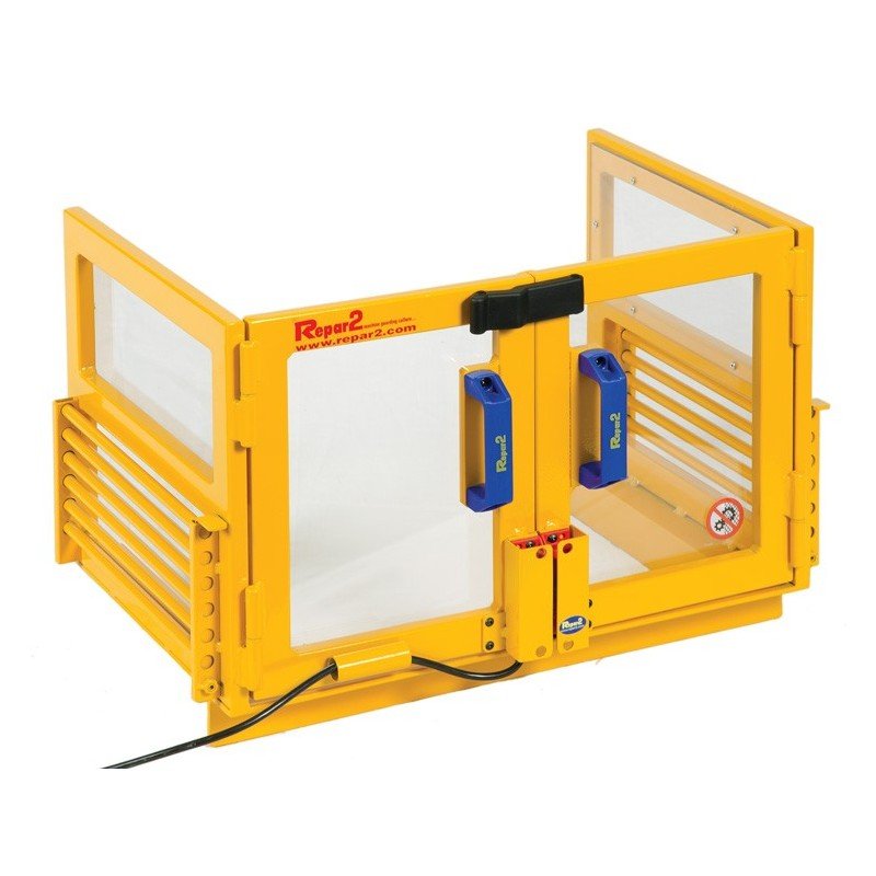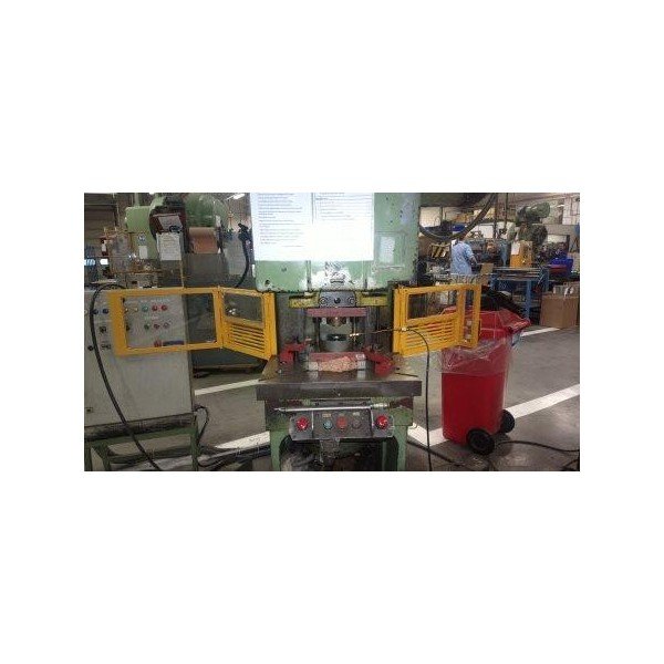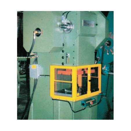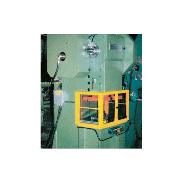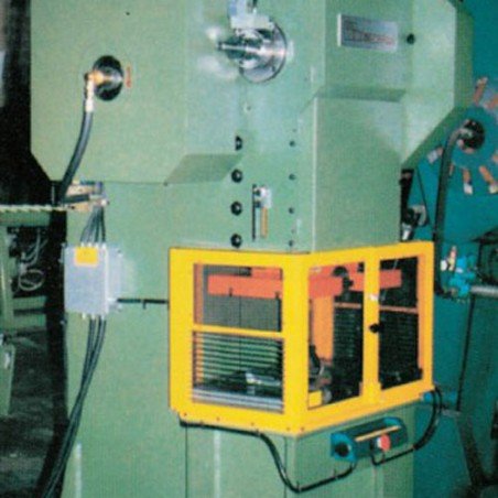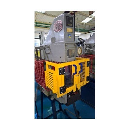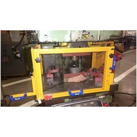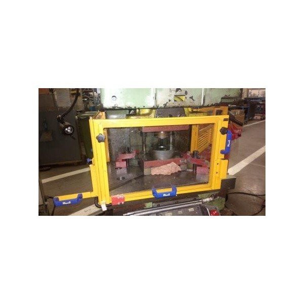 Écran pour presse excentrique à monter sur la table. L'écran est fourni avec 2 parties fixes, chacune équipée d'une porte à charnière et remplies de polycarbonate résistant aux chocs et aux rayures. Les protections latérales sont en partie en polycarbonate et en partie en métal avec des possibilités d’alimentation du matériau.