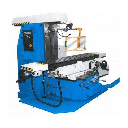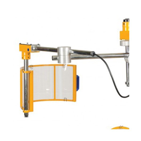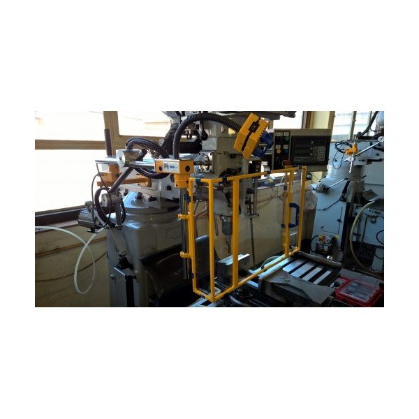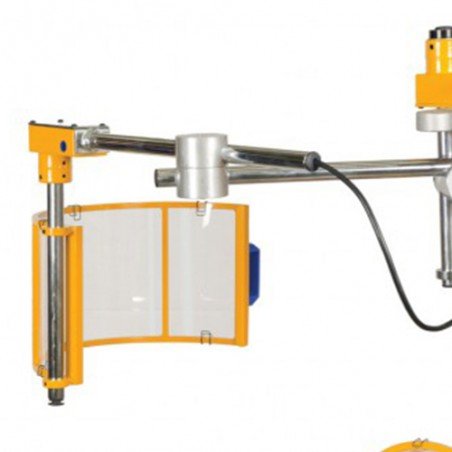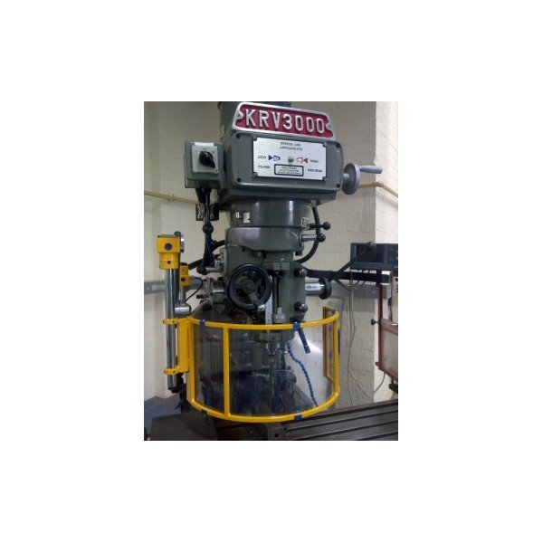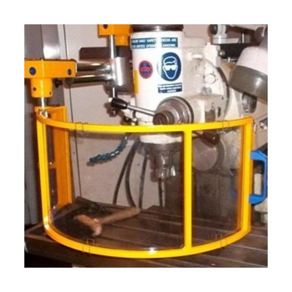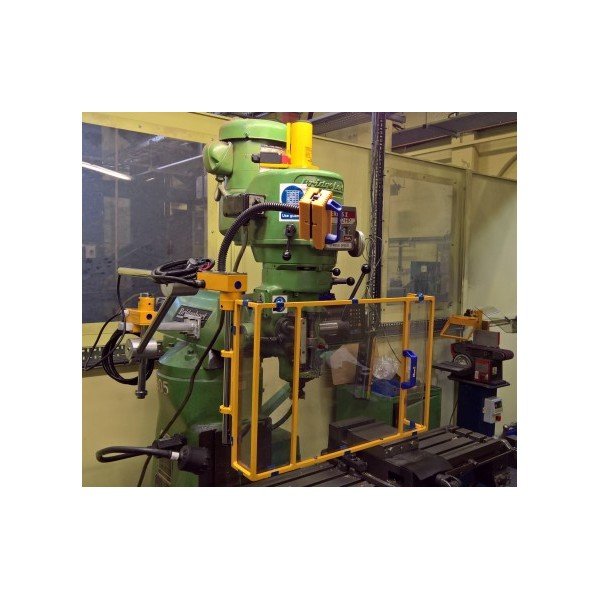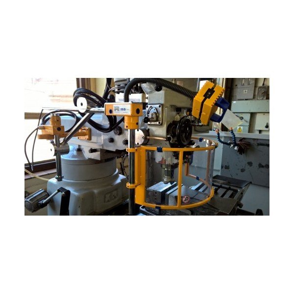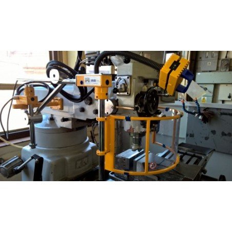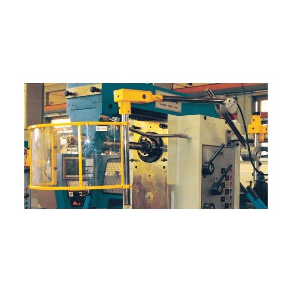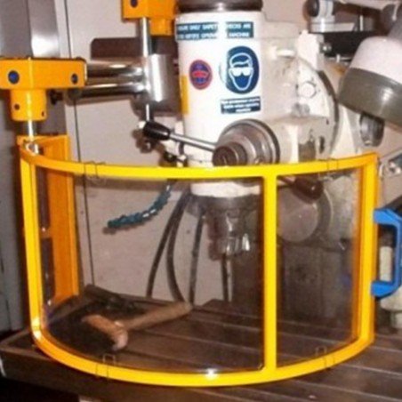 Protection de broche pour une fraiseuse composé d'un écran rond à cadre en acier, rempli de polycarbonate résistant aux chocs et aux rayures, monté sur un bras articulé en structure tubulaire avec double interrupteur de sécurité.