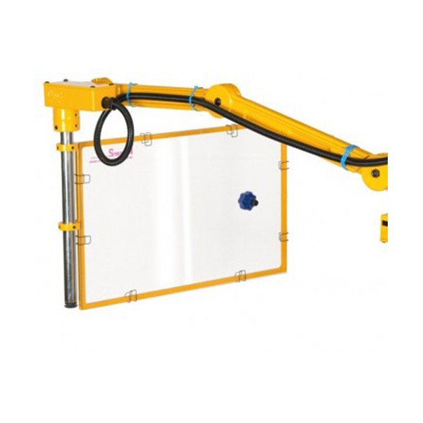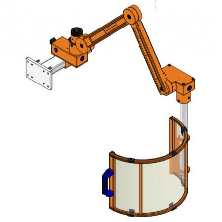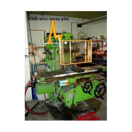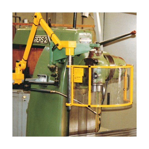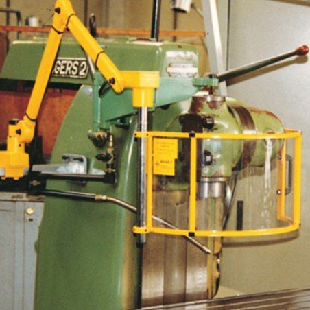 Protection de broche pour une fraiseuse composé d'un écran rond à cadre en acier, rempli de polycarbonate résistant aux chocs et aux rayures, monté sur un bras articulé avec un double interrupteur de sécurité.