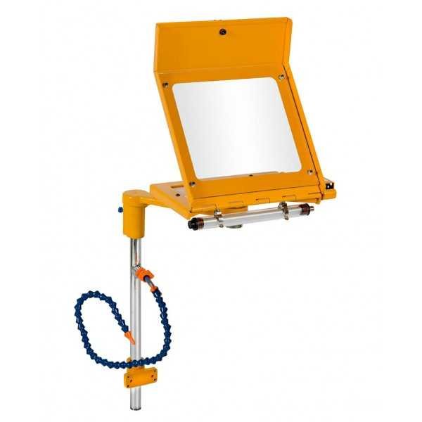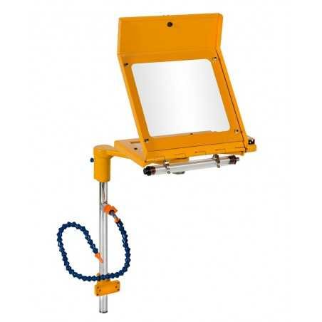 Cache de protection à monter sur la selle du tour composée d'un écran en acier rempli de polycarbonate résistant aux chocs et aux rayures. Ce modèle protège l'opérateur contre le contact direct avec la pièce, le liquide de refroidissement et les copeaux.