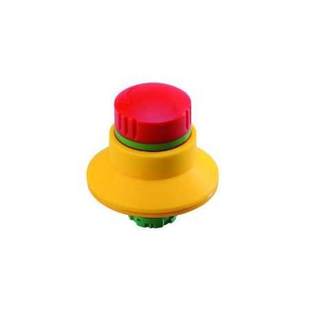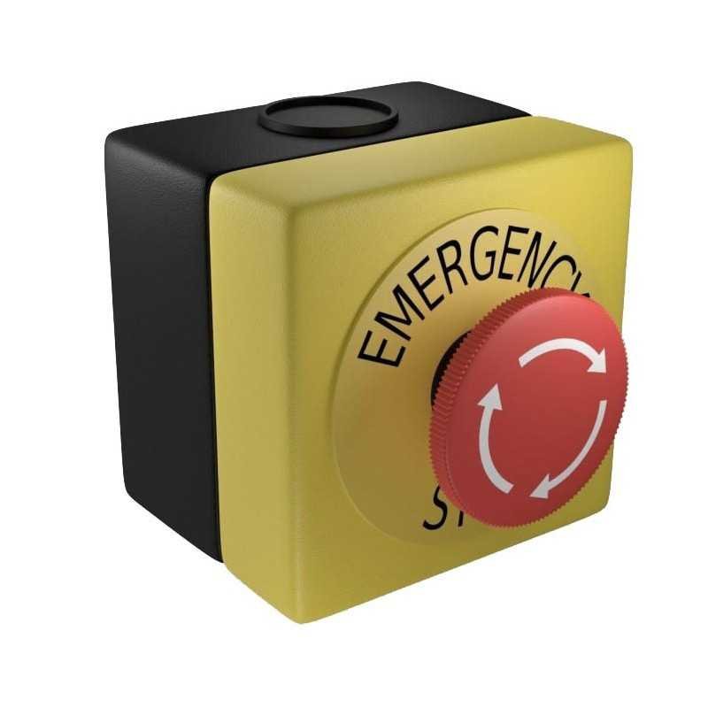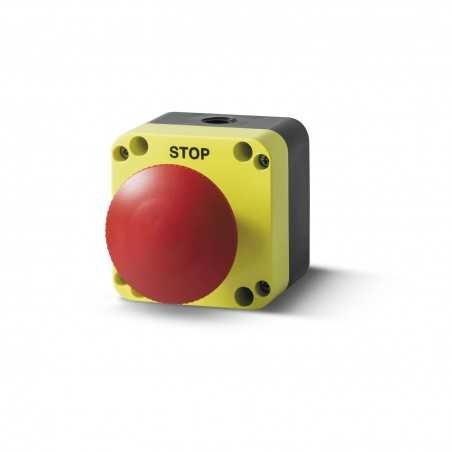 Unité d'arrêt d'urgence composée d'un boîtier (EMBOX) et d'un arrêt d'urgence en forme de champignon avec verrouillage d'un quart de tour.