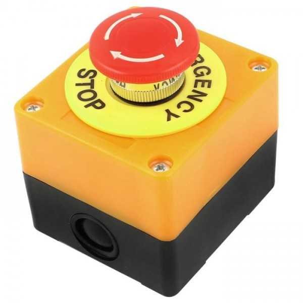 Boîtier avec bouton d'arret d'urgence. Le bouton arrête instantanément la machine en cas d’incident.