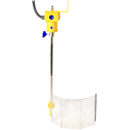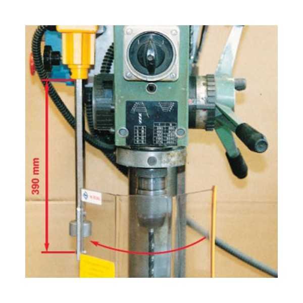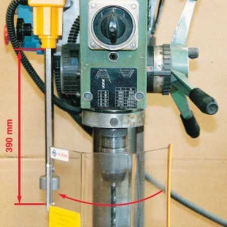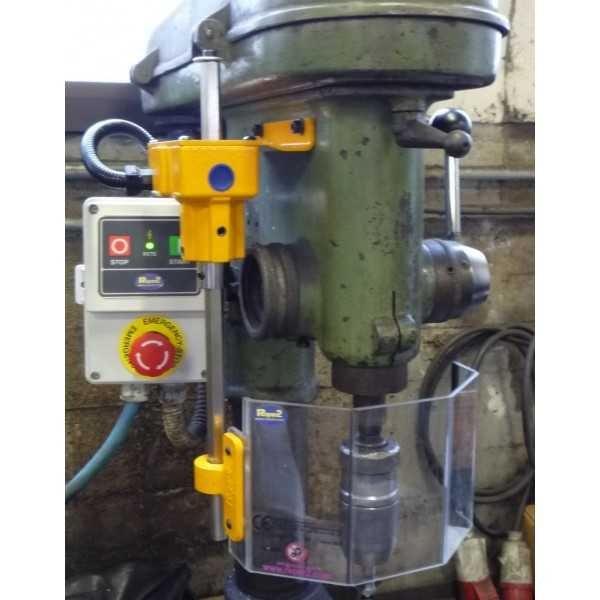 Beschermkap voor boormachine bestaande uit een hoekig scherm in slagvast en krasvrij polycarbonaat bevestigd op een steun voorzien van veiligheidsschakelaar. De beschermkap van 200x120mm is in hoogte regelbaar. Bij opening van de beschermkap valt de machine stil. Dit scherm beschermt de operator voor de draaiende spindel en het snijgereedschap alsook tegen spaanders, koelwater en olie. Voordelen: - Grote zichtbaarheid op de spindel en op het snijgereedschap - Eenvoudige hoogteregeling Specificaties: - hoekig afscherming in polycarbonaat - Scherm 200x120mm - Veiligheidsschakelaar - Toestel geleverd met CE-conformiteitscertificaat en een installatie- en gebruiksblad