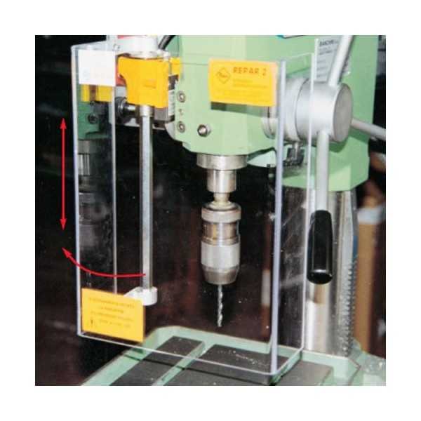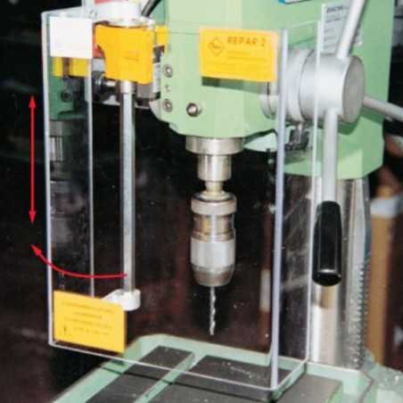 Beschermkap voor boormachine bestaande uit een rechthoekig scherm in slagvast en krasvrij polycarbonaat bevestigd op een steun voorzien van veiligheidsschakelaar.