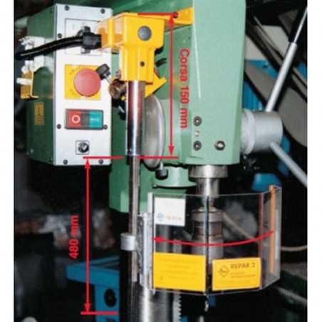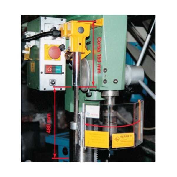 Beschermkap voor boormachine bestaande uit een hoekig scherm in slagvast en krasvrij polycarbonaat bevestigd op een telescopische steun voorzien van veiligheidsschakelaar. De beschermkap van 200x120mm is in hoogte regelbaar. Bij opening van de beschermkap valt de machine stil. Dit scherm beschermt de operator voor de draaiende spindel en het snijgereedschap alsook tegen spaanders, koelwater en olie. Voordelen: - Grote zichtbaarheid op de spindel en op het snijgereedschap - Eenvoudige hoogteregeling via telescopische steun Specificaties: - hoekig afscherming in polycarbonaat - Scherm 200x120mm - Veiligheidsschakelaar - Toestel geleverd met CE-conformiteitscertificaat en een installatie- en gebruiksblad