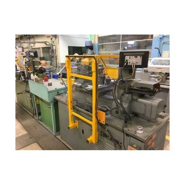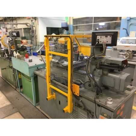 Protective cover for the chuck of a small lathe consisting of a fixed upward-tilting shield with a gas spring and a safety switch.