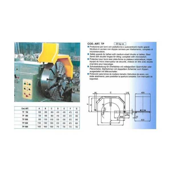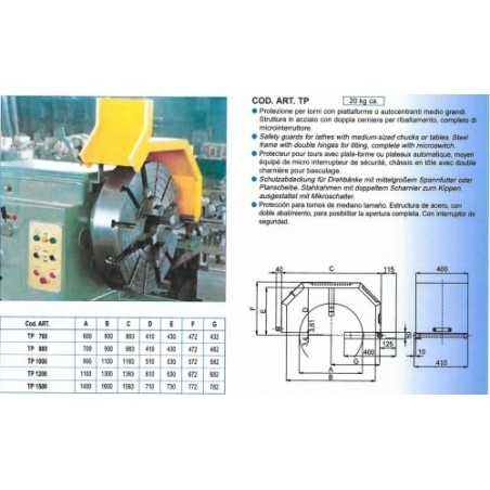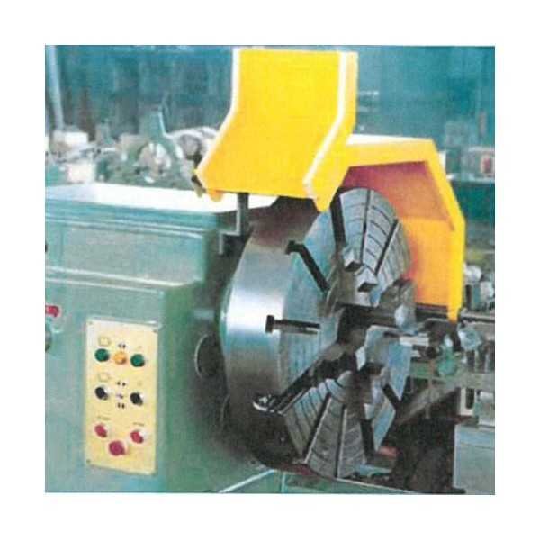 Volledig metalen beschermkap voor onafhankelijke vierklauw of stelplaat van een draaibank voorzien van een dubbele scharnier en zijdelings omhoog klapbaar. De afscherming is voorzien van een dubbele veiligheidsschakelaar en is verkrijgbaar voor klauwplaten met diameters van 700 ; 800 ;1000 ;1200 ;1500mm Dit model beschermt de bedienaar tegen direct contact met het werkstuk, koelvloeistof en spaanders. Voordelen: • schokbestendige beschermkap • dubbelzijdige bescherming • zijdelings omhoogklapbaar Specificaties : - dubbele veiligheidsschakelaar - Beschikbare afschermingen voor diameters klauwplaat 1500; 1700; 2000mm. - Toestel geleverd met CE-conformiteitscertificaat en een installatie- en gebruiksblad