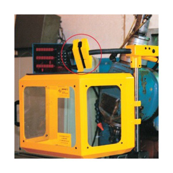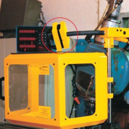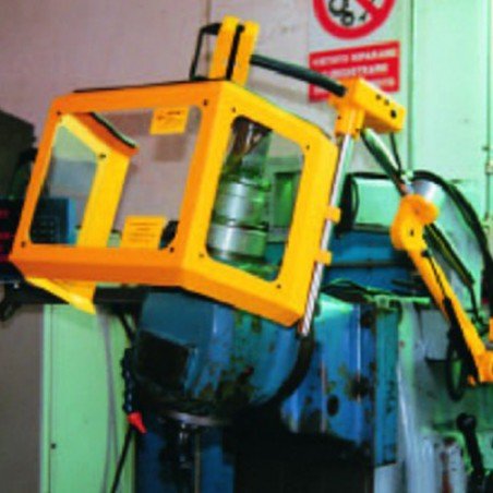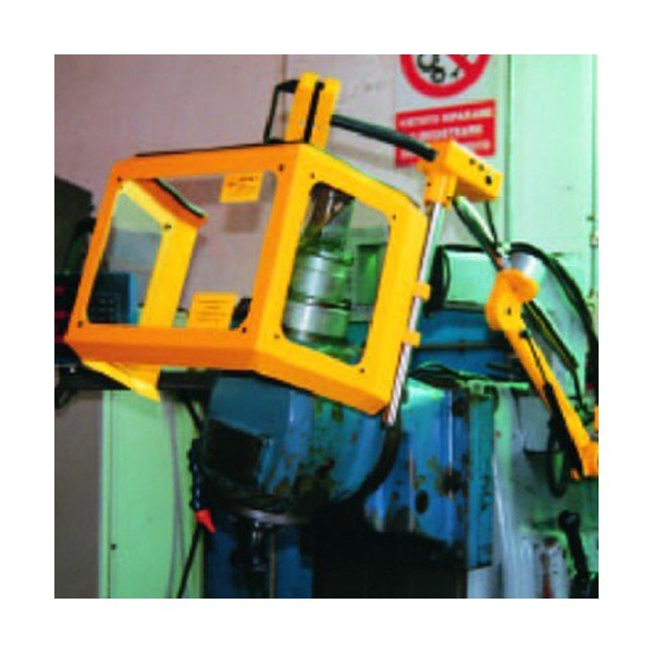 Spindle shield for a milling machine composed of a screen with an angular steel frame, filled in with impact-resistant and scratch-free polycarbonate (P) or safety glass (V), mounted on an articulable arm with 2 safety switches.